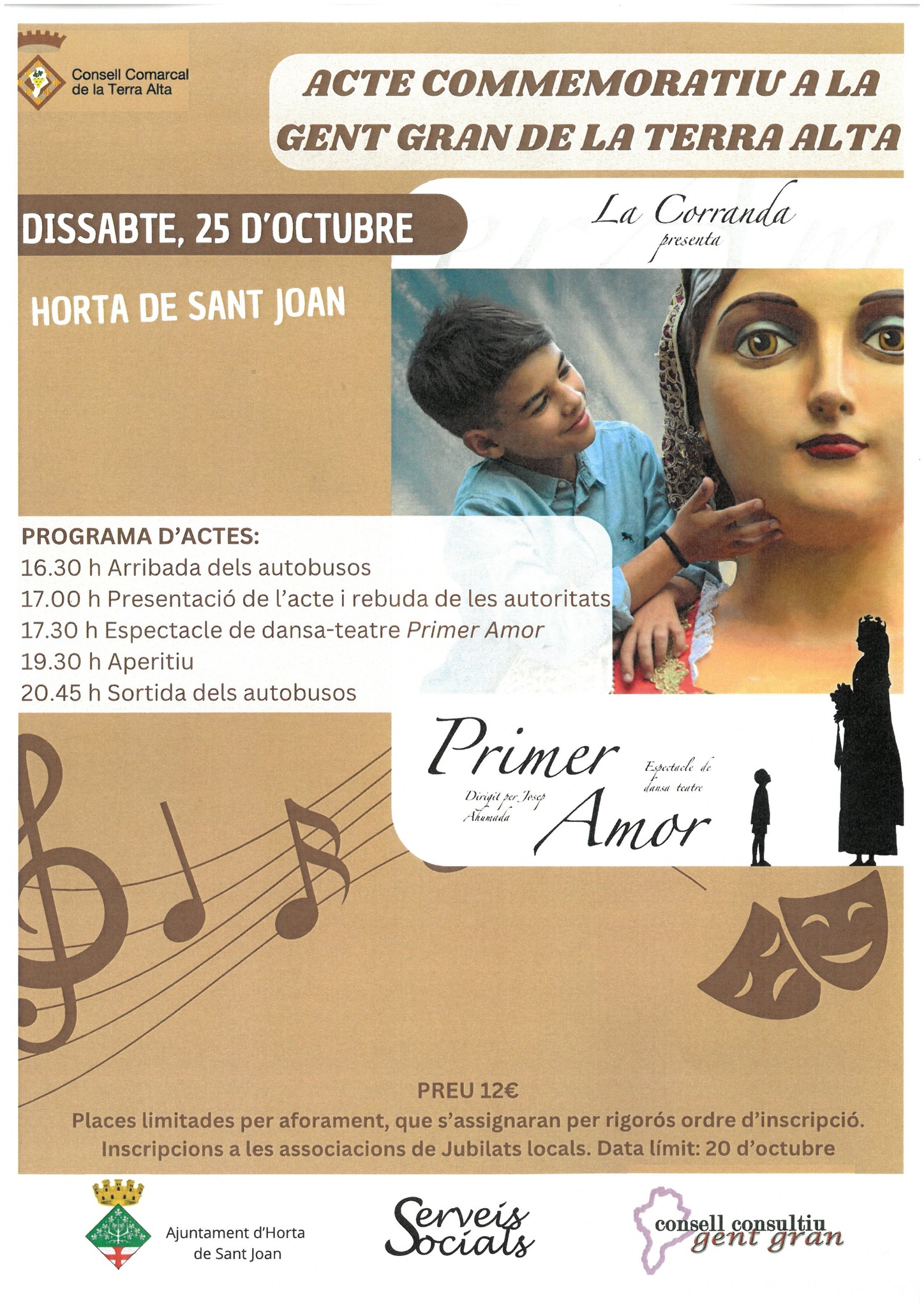 Date 25 10 2025 Time 13:00 - 23:00 ACTE COMMEMORATIU A LA GENT GRAN DE LA TERRA ALTA A HORTA DE SANT JOAN Share this event + Add to Google Calendar + iCal export 00 days 00 hours 00 minutes 00 seconds